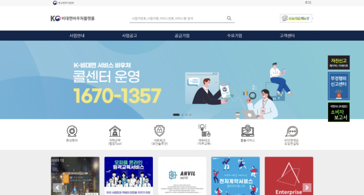 국내 중소기업의 화상회의, 재택근무 등을 위한 비대면 툴(Tool) 및 프로그램 지원을 통해 기업의 디지털화 촉진 및 비대면 서비스 분야 육성을 위한 사업 (코로나의 영향도 한 몫함) 하지만 화상회의를 하는 기업이 아니더라도, 비대면과 관련이 있다면 신청 꼭 해보길 바란다. 나는 중소기업 사업자도 아니고 이리저리 속하는 곳이 없지만, 주변에 꽤나 비대면 관련 소기업들이 보여서 정보공유 해봄. 자세한 내용은 아래의 K-비대면 바우처 플랫폼의 사업공고를 참고 하길. https://www.k-voucher.kr/community_plan_view.php (안되면 콜센터 전화 ㄱㄱ)
